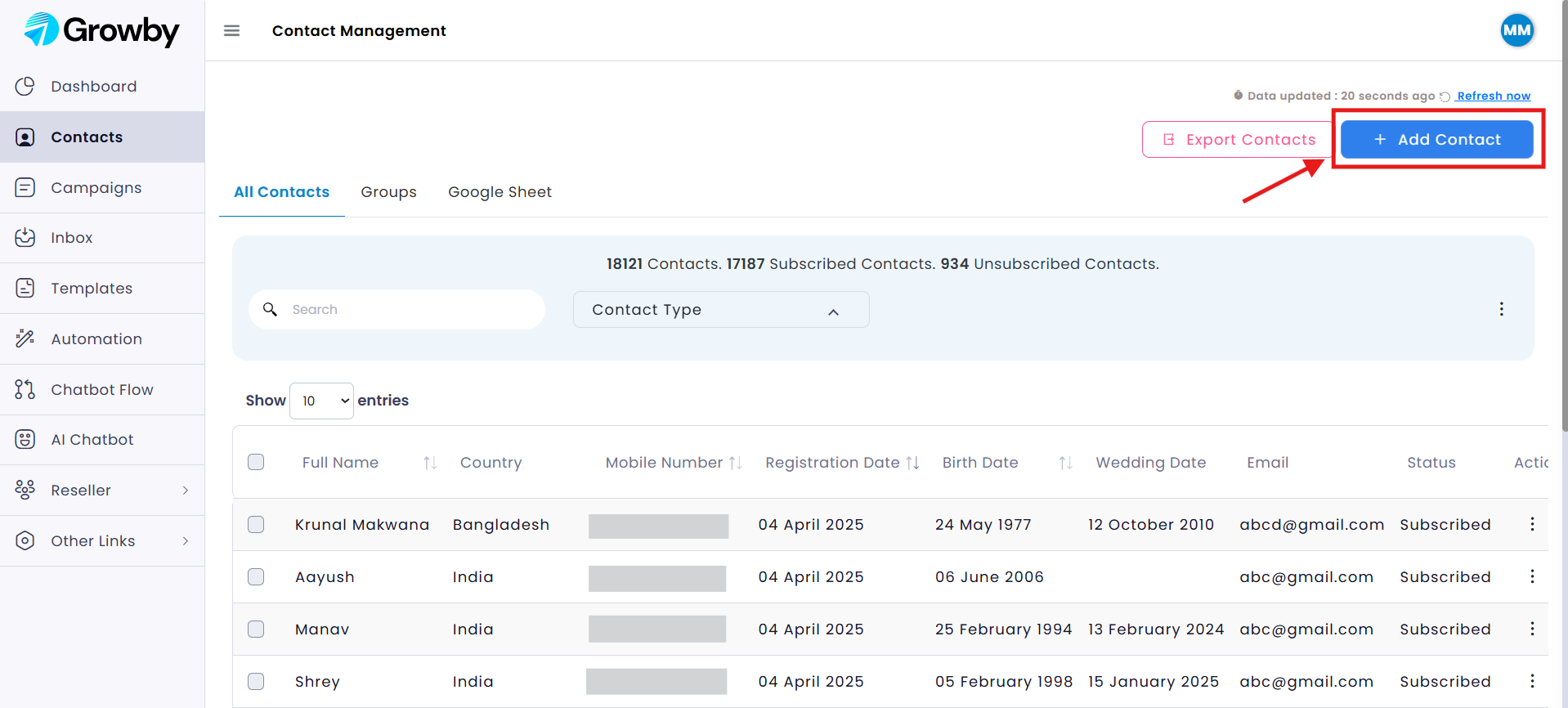 Click on “Add Contact” button located on the top-right corner to begin adding new contact.